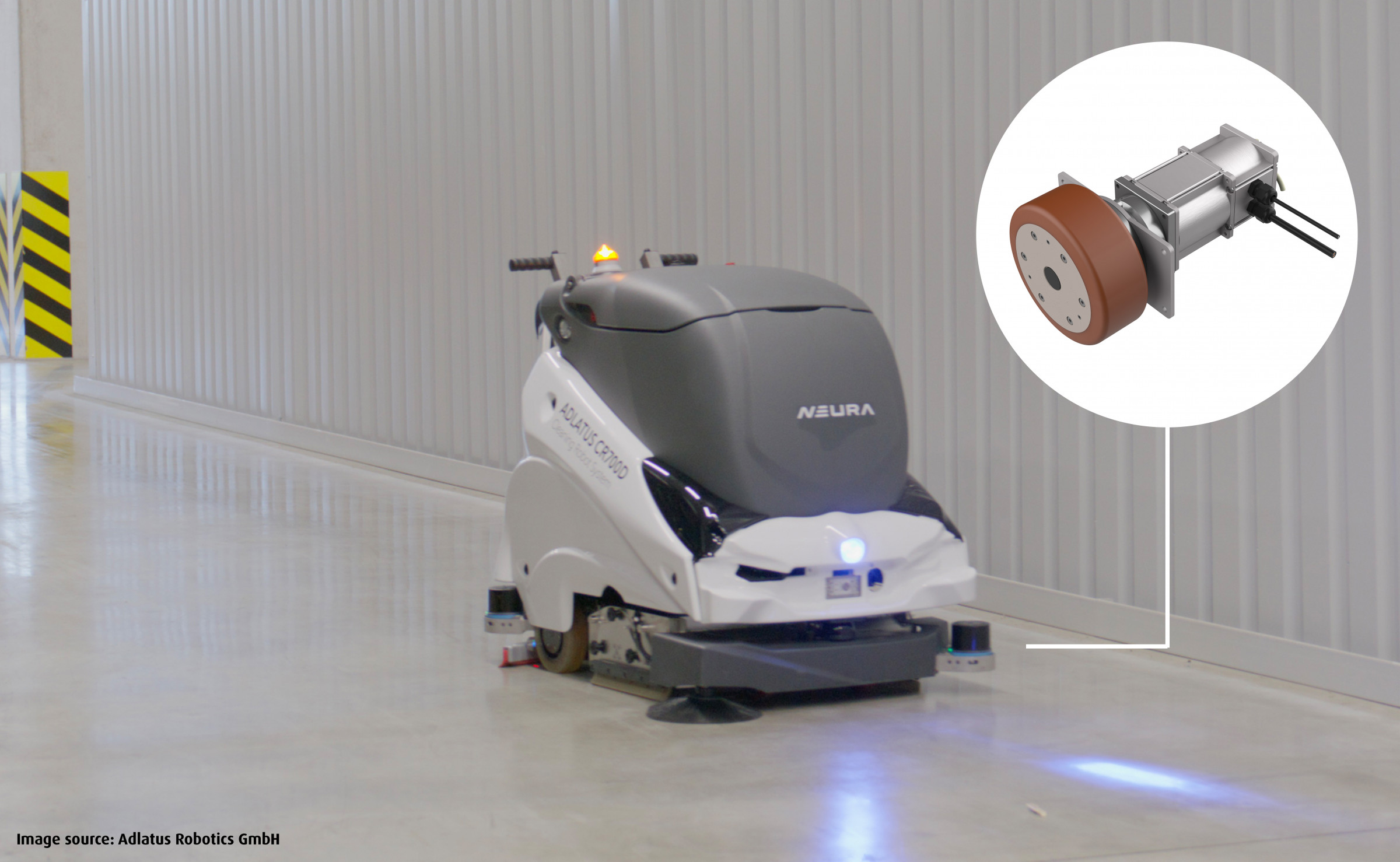 Auch in der Reinigungsrobotik beweisen sich die hochintegrierten Radnabenantriebe (RNA) von Framo Morat. Die modular aufgebauten Systeme vereinen Rad, Planetengetriebe, Motor, Bremse und Elektronik in einer kompakten Einheit. So kommt der RNA250 im autonomen Reinigungsroboter CR700C von Adlatus Robotics zum Einsatz. Dieser deckt in der zweistufigen Variante mit einer Gesamtsystemlänge von kleiner 235 mm und einer Standard-Radgröße von 125 mm bis zu 250 kg Traglast pro Rad ab. Durch die kürzlich bekanntgegebene Partnerschaft zwischen Adlatus Robotics und Neura Robotics stärken die beiden Unternehmen durch intelligent vernetzte Systeme ihre Präsenz im Umfeld der professionellen Service- und Reinigungsrobotik.